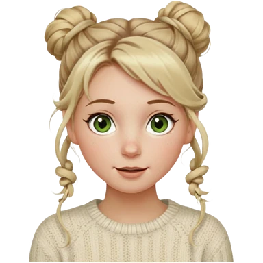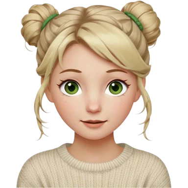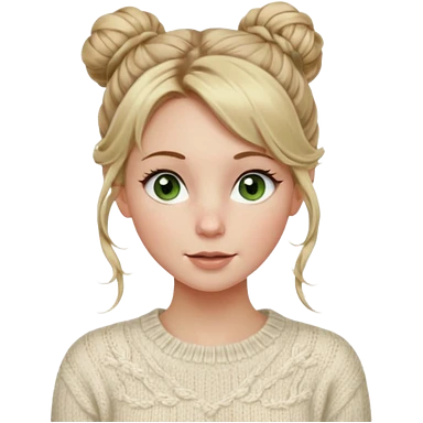 dirty blonde hazel green eyes woman with a white cable knit sweater and one messy bun with tendrils of hair flowing down her face and she is happy pale, some freckles, blush. she has a cateye wing and long lashes emoji
