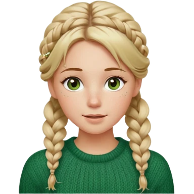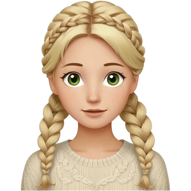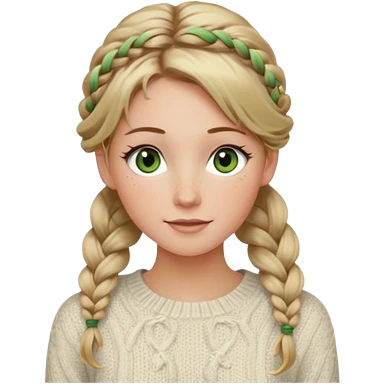 dirty blonde hazel/green eyes woman with a white cable knit sweater and one braid down her back with tendrils of hair flowing down her face and she is happy pale, some freckles, blush. she has a cateye wing and long lashes emoji