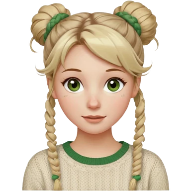 An 11 year old girl with dirty blonde hair, glasses, blue eyes, and a green sweatshirt with a cat on her head emoji