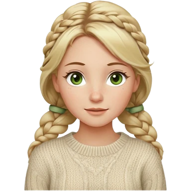 dirty blonde hazel/green eyes woman with a white cable knit sweater and one braid down her back with tendrils of hair flowing down her face and she is happy pale, some freckles, blush. she has a cateye wing and long lashes emoji