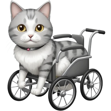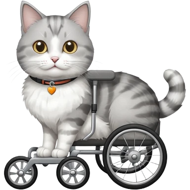 disabled grey and white small cat using a wheelchair made for cats emoji