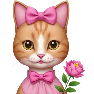 گربهای که یه گل صورتی دستش باشه رو سر خودش پاپیون باشه لباس صورتی تنش باشه و یک کادر صورتی کوچیک بالای سرش باشه emoji