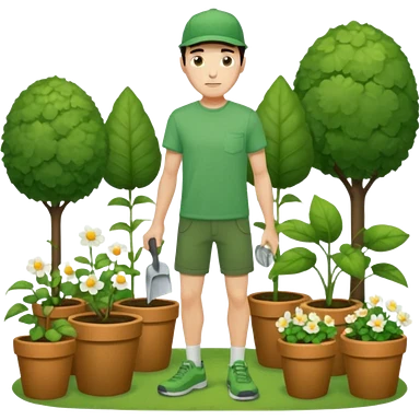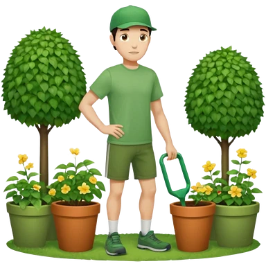 rapaz magro cabelo escuro com boné verde claro, camiseta verde e bermuda verde escuro, corpo inteiro cuidando do jardim emoji