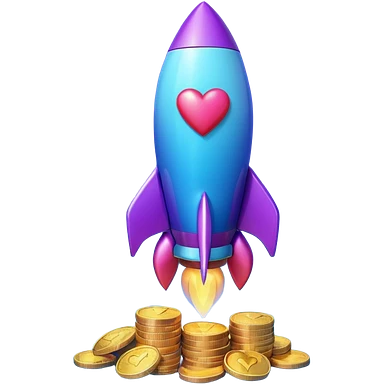 3D rocket with coins and hearts, purple blue gradient, glossy, transparent background emoji