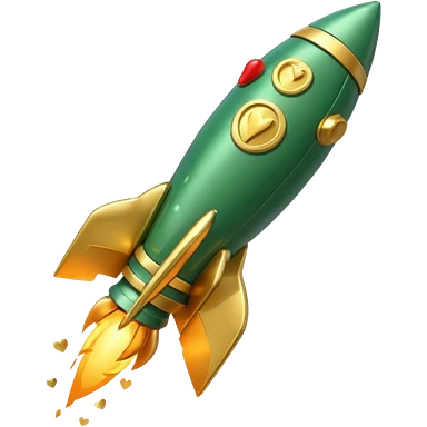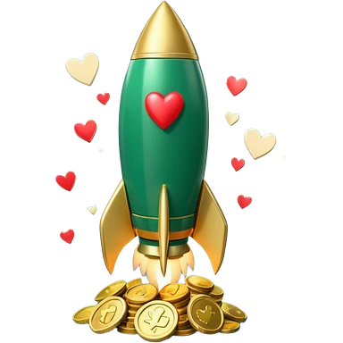 3D rocket with coins and hearts, deep green color (#0B3D2C), gold accents (#C9B037), cream highlights, glossy modern style, transparent background emoji