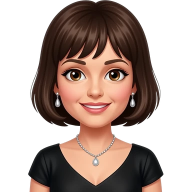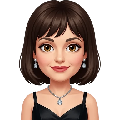 Liza Minnelli with brown eyes, dark brown 70s short hair, black hollywood dress, necklace and earrings emoji