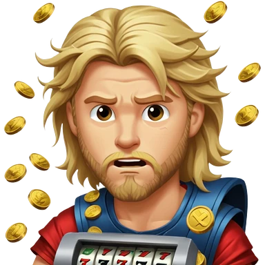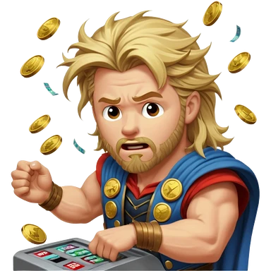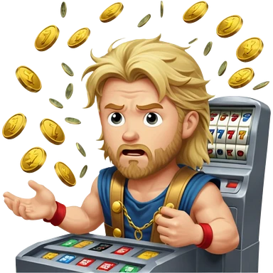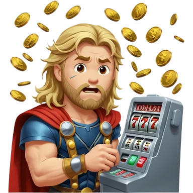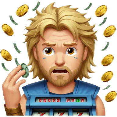 disheveled Thor losing money at a slot machine, panicked face, coins flying emoji