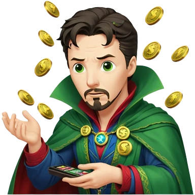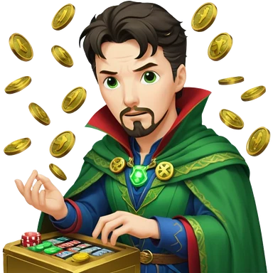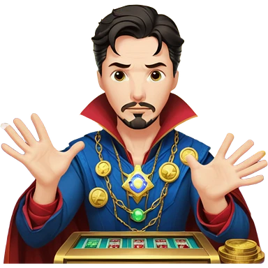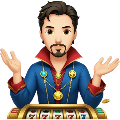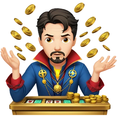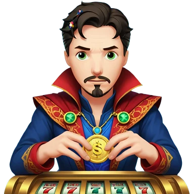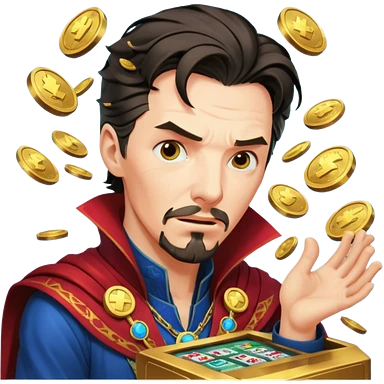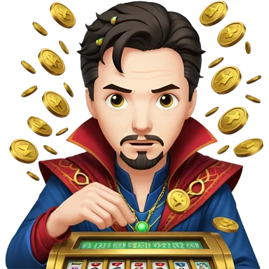 disheveled Doctor Strange losing money at a slot machine, panicked face, coins flying emoji