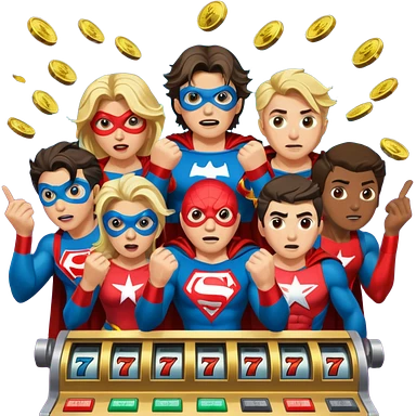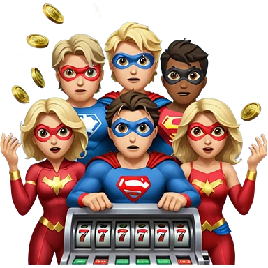 disheveled super heros losing money at a slot machine, panicked face, coins flying emoji