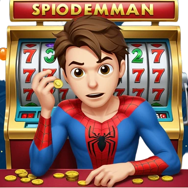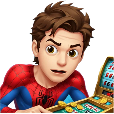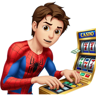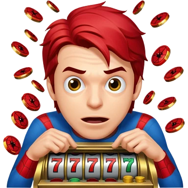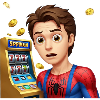 disheveled spiderman losing money at a slot machine, panicked face, coins flying emoji
