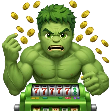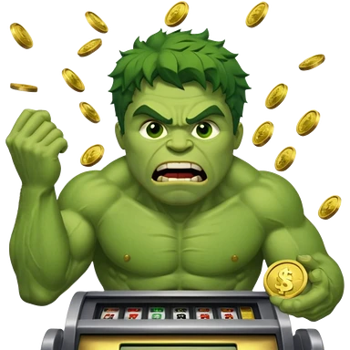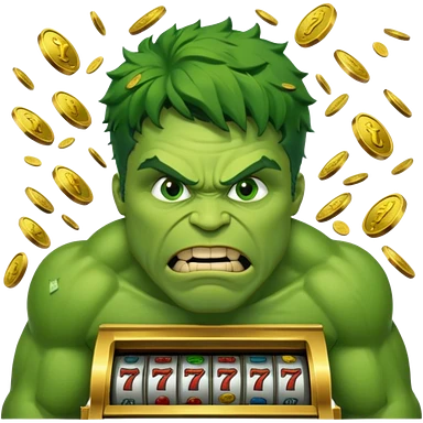 disheveled hulk losing money at a slot machine, panicked face, coins flying emoji