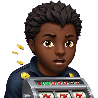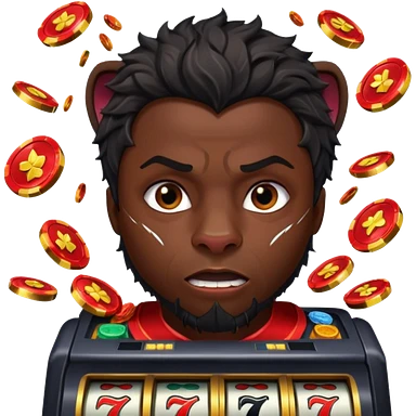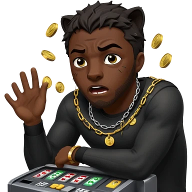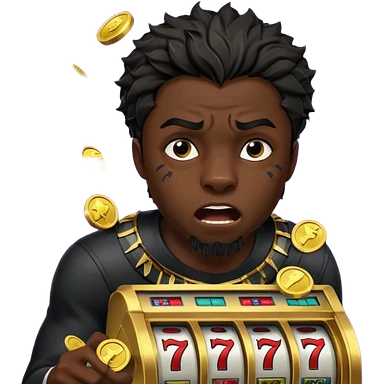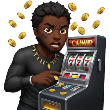 disheveled Black Panther losing money at a slot machine, panicked face, coins flying emoji