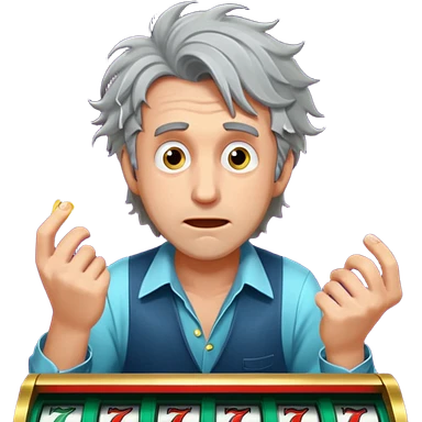 disheveled man losing money at a slot machine, panicked face, coins flying emoji