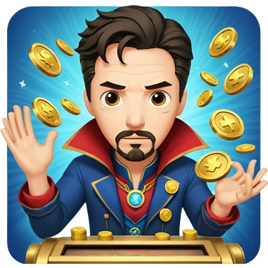 disheveled Doctor Strange losing money at a slot machine, panicked face, coins flying emoji