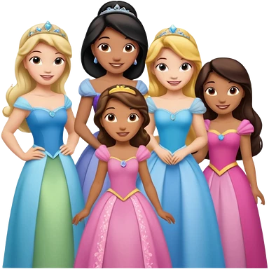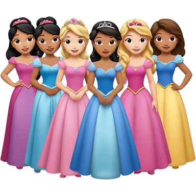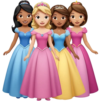 four minimal Disney princesses in one image: Belle with yellow dress, Tinkerbell with wings, Ariel with red hair and tail, Cinderella with blue dress emoji