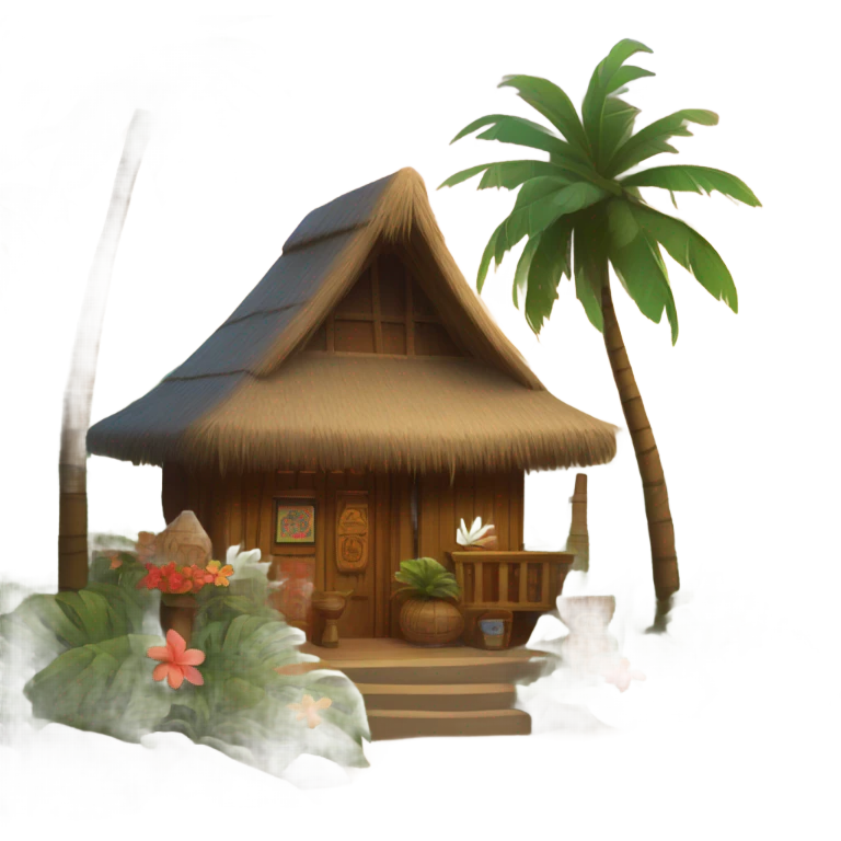 Isometric exterior brown and beige and green luxury polynesian beach resort restaurant, dollhouse style 3D realistic emoji