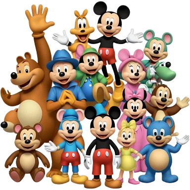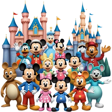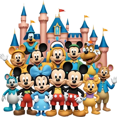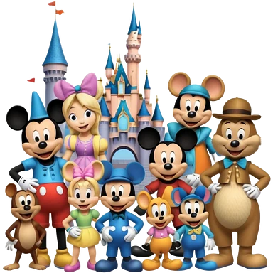 Colorful icon for Animated Movies: A vibrant collage featuring iconic characters like Goofy, Mickey Mouse, Franco, Masha and the Bear and Luntik. Each character should be large and bright, set against a cheerful and playful background of Disneyland. Transparent background. emoji