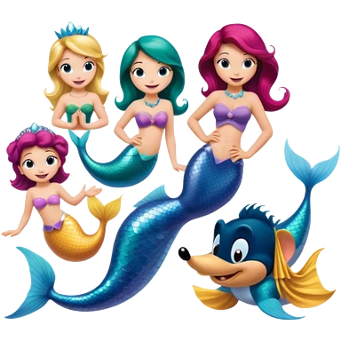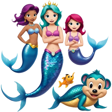 Colorful icon for Animated Movies: mermaid costume and could A vibrant collage featuring iconic characters like Goofy, Mickey Mouse, Franco, Masha and the Bear and Luntik. Each character should be large and bright, set against a cheerful and playful background of Disneyland. Transparent background. emoji