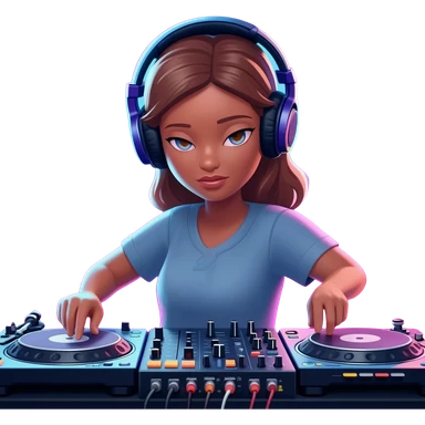 Create a professional and technical emoji that represents remixing music. The design should feature a high-end DJ controller, turntables with vinyl records, and a sound mixing console with faders to symbolize the technical aspects of remixing. Include elements like studio headphones and a laptop or digital audio workstation (DAW) screen to reflect the tools used in music production. Use colors like black, silver, and neon accents to convey the professional, high-tech nature of remixing. The background should be transparent. emoji