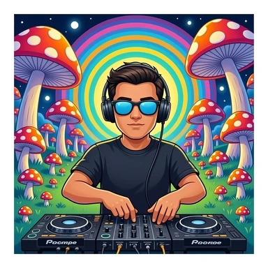 DJ behind a controller, the background as a psychedelic scene filled with spychedelic mushroom emoji