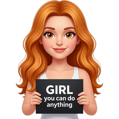 sexy girl with long wavy ginger hair and ginger eyes wearing a white tanktop is holding a black colored sign with GIRL you can do anything written on it emoji