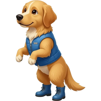 Make me a yellow and brown dog, a golden retriever, with floppy ears, that stands on two legs, has a white patch on its chest, wears a blue vest and boots Draw it in a cute cartoon style. do it in profile emoji