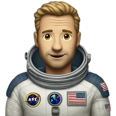 Un astronauta con una tuta spaziale rossa in piedi su una navetta, con un visore scuro emoji