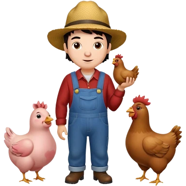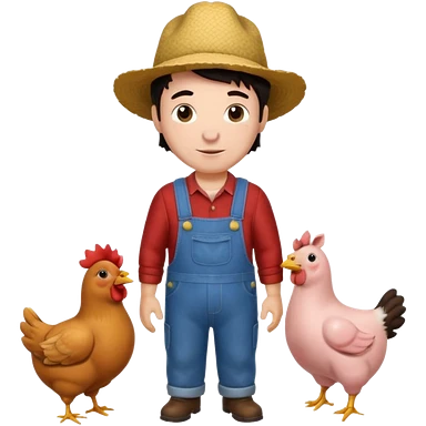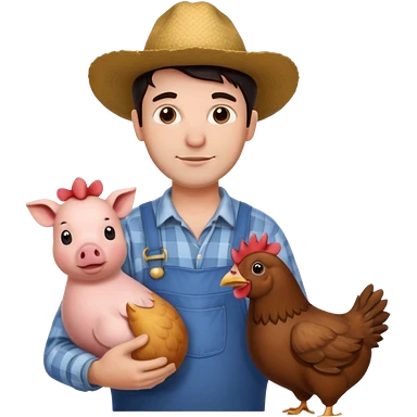 UN HOMBRE VESTIDO DE GRANJERO PIEL CLARA Y PELO OSCURO CON UNA GALLINA UN CERDO Y UNA VACA ALREDEDOR emoji