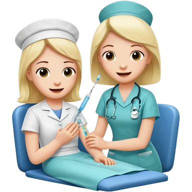 Create a cute sexi girl, funny sticker-style story in a cartoon illustration. Scene sequence shows a nervous patient getting an injection from a kind nurse. emoji