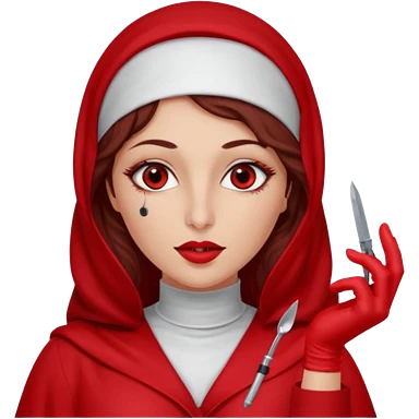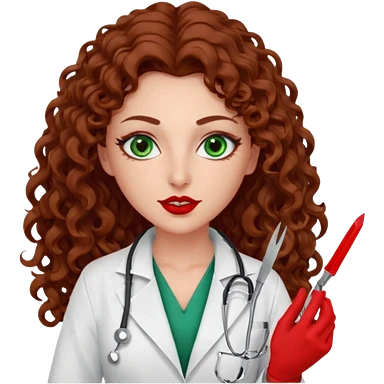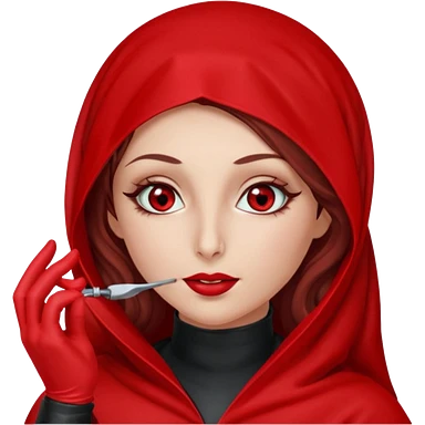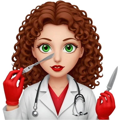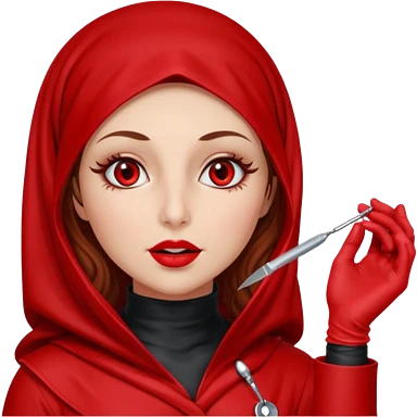 Lilith symbol sexy evil woman. She has green eyes. had brown long curly hair. evil surgeon kills with scalpel wears red sexy doctor coat with red mouth cover red gloves. Covers nose, neck and mouth with red cloth emoji