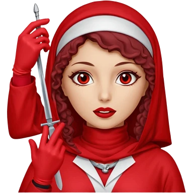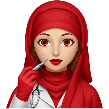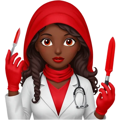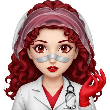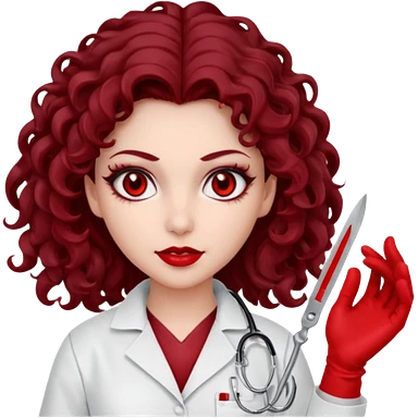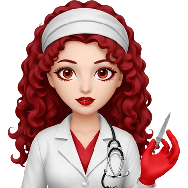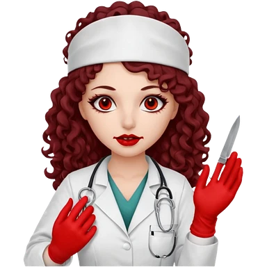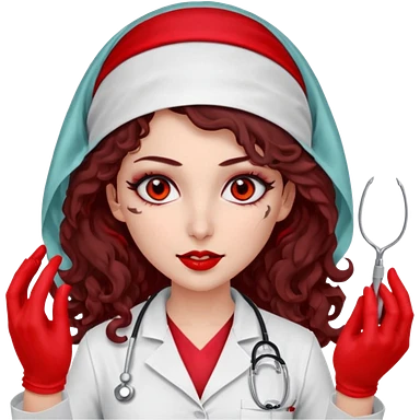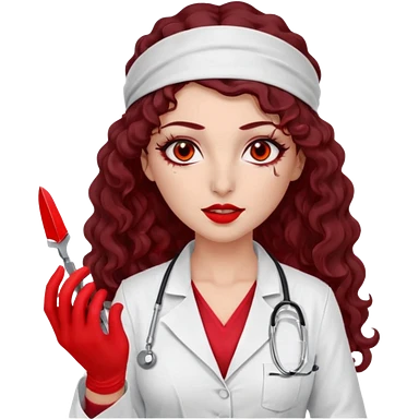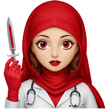Lilith scalpel in hand, evil surgeon outfit. She has red eyes. She has dark brown curly hair. Hair is long . Wears sexy doctor outfit with red gloves. Covers nose, neck and mouth with Muslim red burka emoji