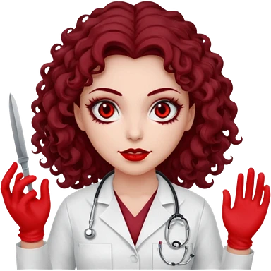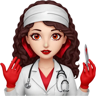 Lilith scalpel in hand, evil surgeon outfit. She has red eyes. She has dark brown curly hair. Hair is long . Wears sexy doctor outfit with red gloves. Covers nose, neck and mouth with Muslims emoji