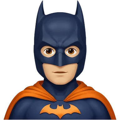 generate a batman emoji with just the face and neck showing and part of the cloak and and wings. Shade the mask in dark navy blue. Shade the cloak in a solid vibrant orange. Shade the bat logo in a bright medium olive green. emoji