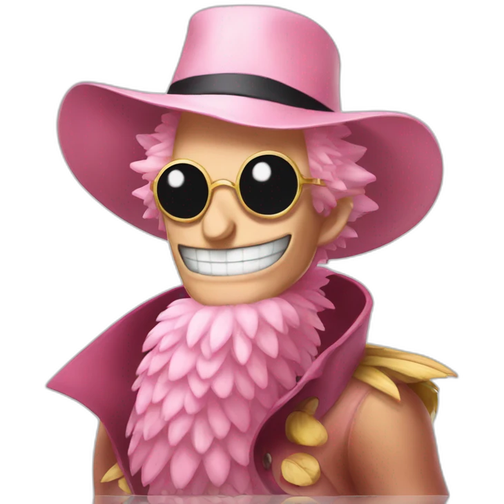 Doflamingo’s glasses are large, round, and pink with reflective, light pink lenses. The thin, delicate frames give off a flamboyant and regal vibe. emoji