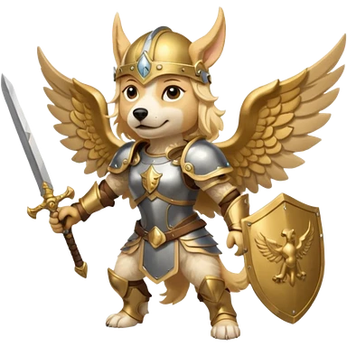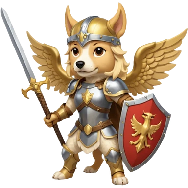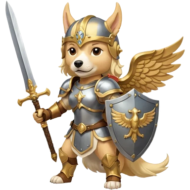 dog freya has sword and shield. she is a valkyrie and has wings. dynamic pose emoji