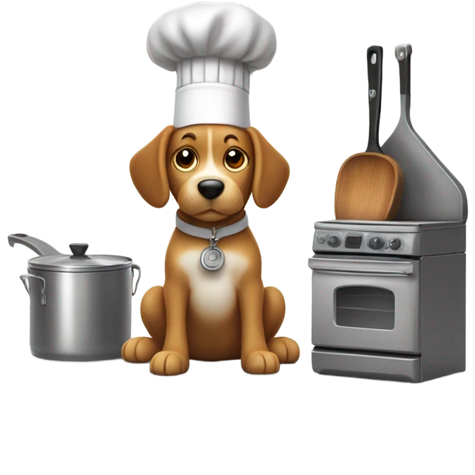 Dog wearing a chefs hat and surfing on a wave of dog food emoji