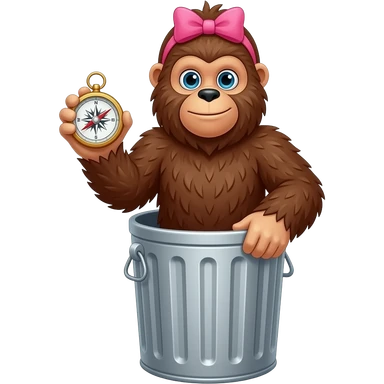 Full body sasquatch with pink bow in hair holding a compass standing in trashcan emoji