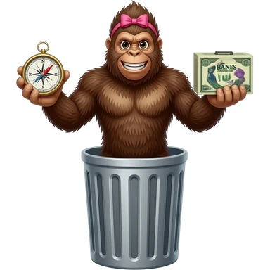 Full body sasquatch with pink bow in hair holding a compass in 1 hand and bank with banksy on it in other hand standing in trashcan emoji