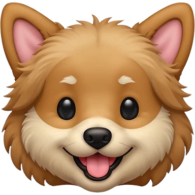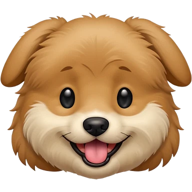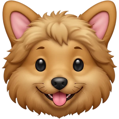 Dog face only, light brown fluffy dog, darker ears, small black nose, happy smiling with tongue out, simple emoji icon. emoji