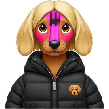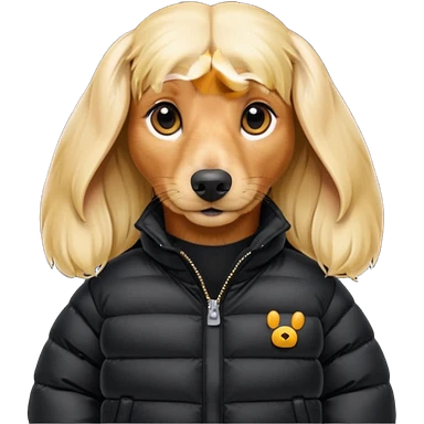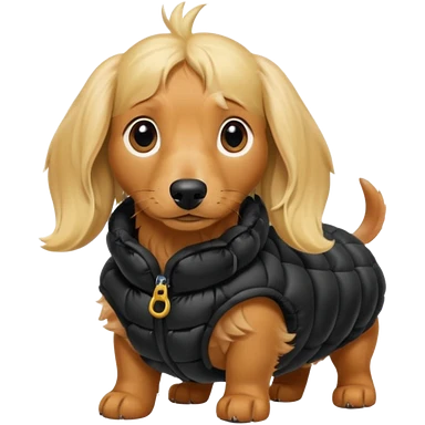 Long hair blonde Daschund dog in oversized black puffer emoji