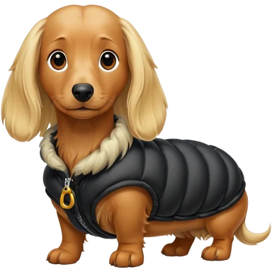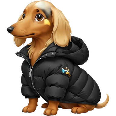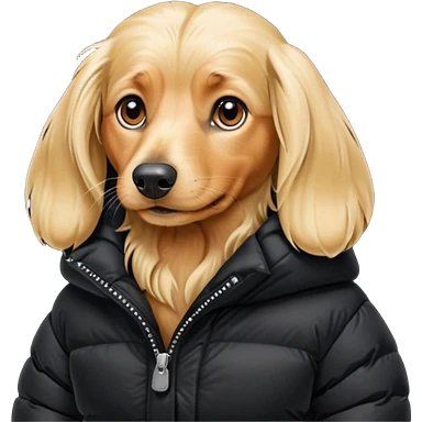 Long hair blonde Daschund dog in huge black puffer emoji