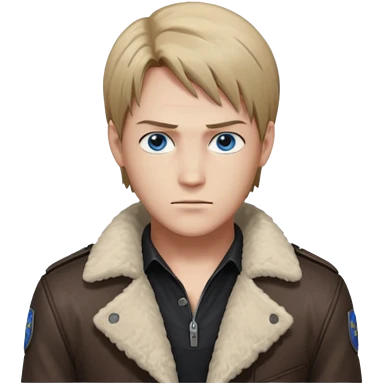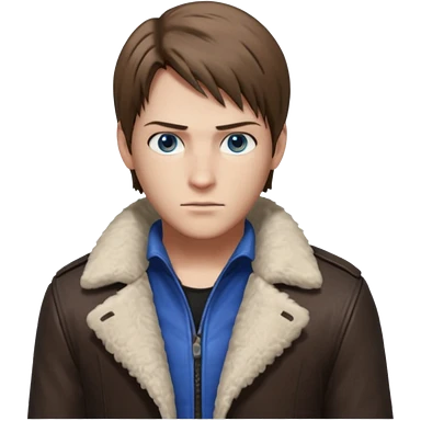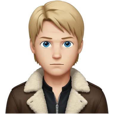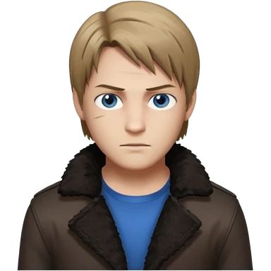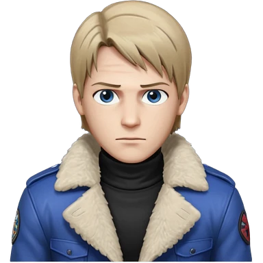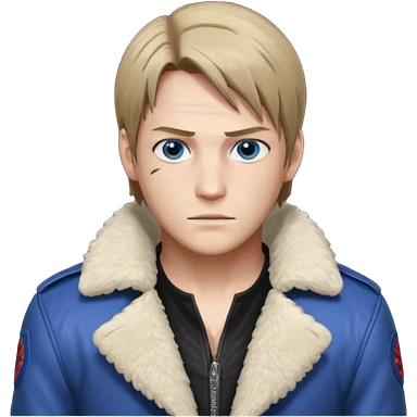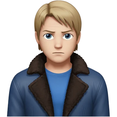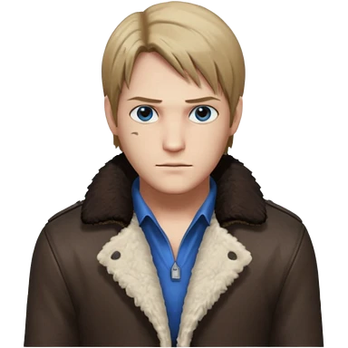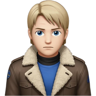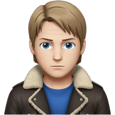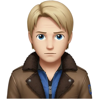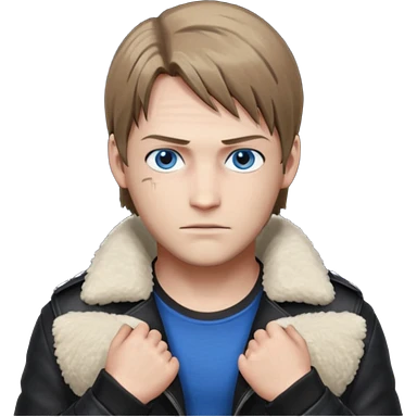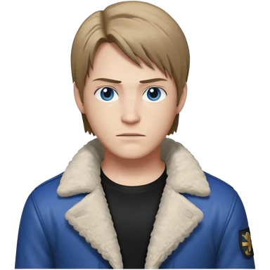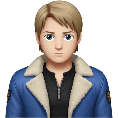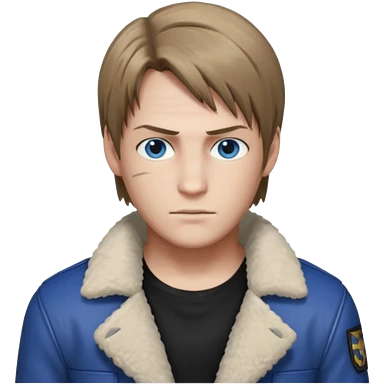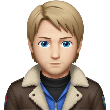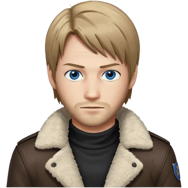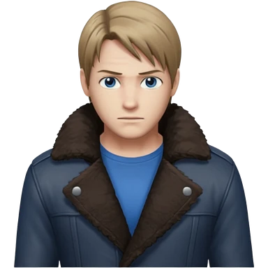Leon Kennedy from resident evil 4 remake in sheepskin coat and black t-shirt blue eyes clean-shaved emoji