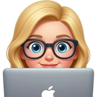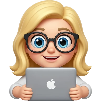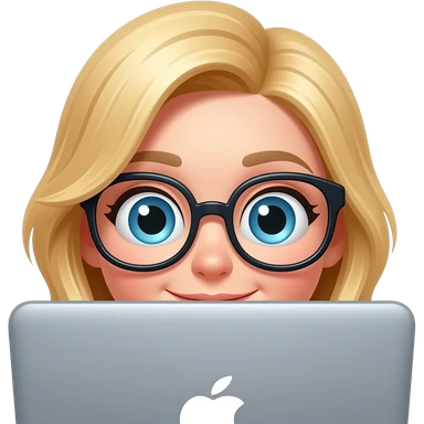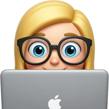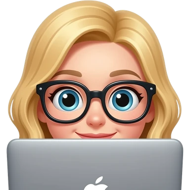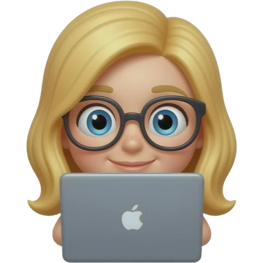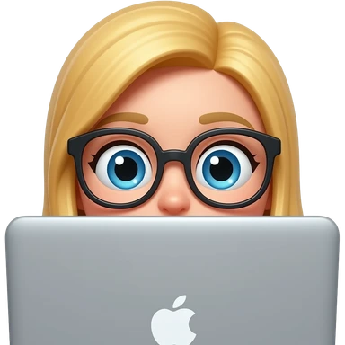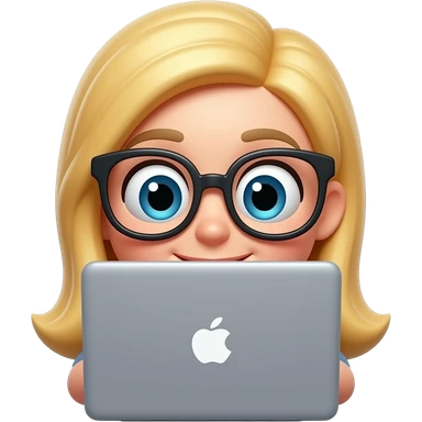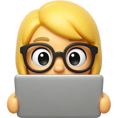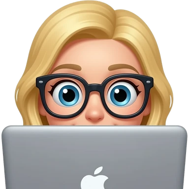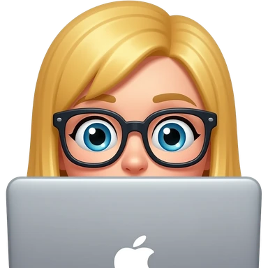 3D emoji-style female character with blode hair and big glasses, eyes wide, peeking over a laptop, emoji