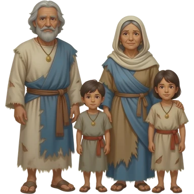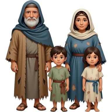 A poor nomadic family with an old man old woman and 2 children, wearing old tattered draped clothing from biblical times emoji
