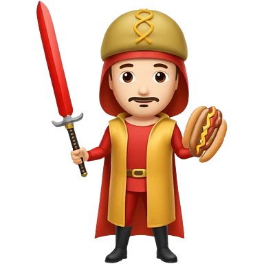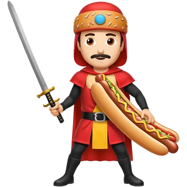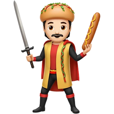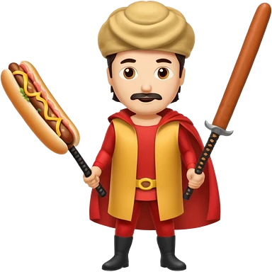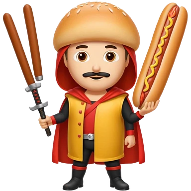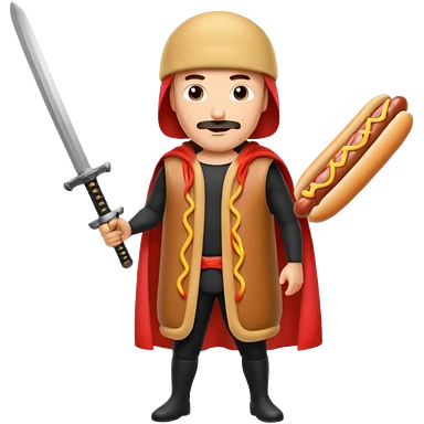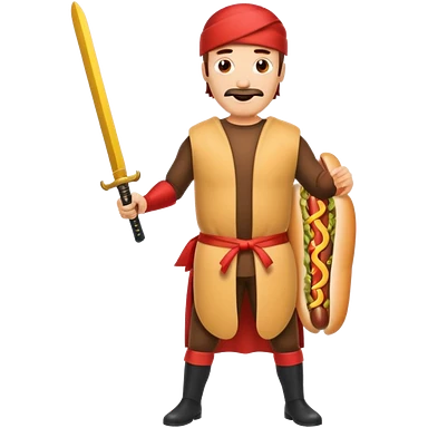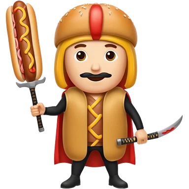 Middle aged attractive man wearing a hot dog costume wielding a katana emoji