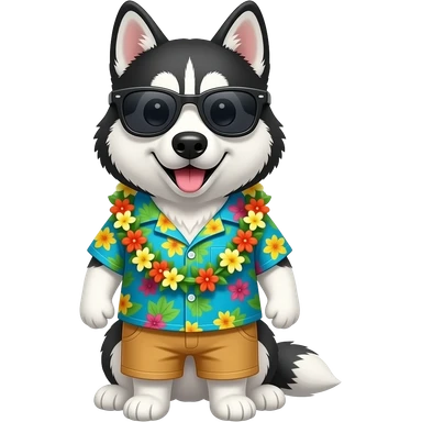 husky Dog – wearing colorful aloha shirt and sunglass front facing emoji