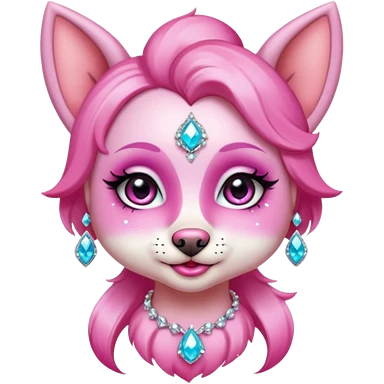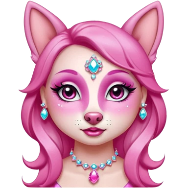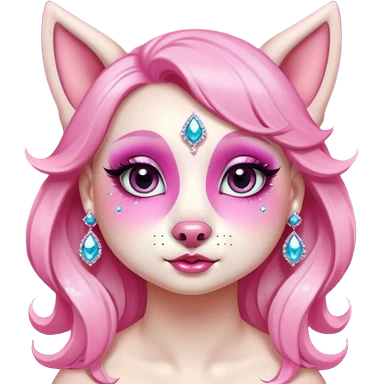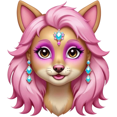 glamorous dog portrait, head and shoulders only, exaggerated pink makeup, bright eyeshadow, long eyelashes, shiny blush cheeks, sparkling face gems, glitter accents, elegant earrings, fantasy beauty style, cute 3D cartoon, mobile game icon style, clean background, no text, no watermark emoji