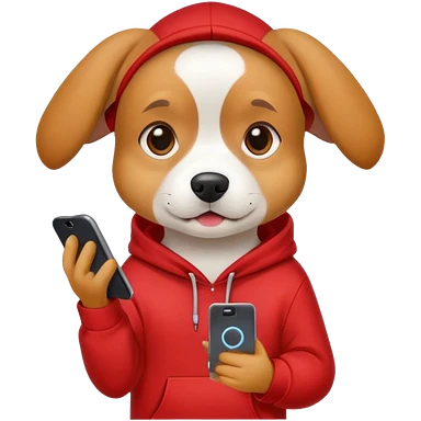 A moody looking dog looking down at his phone wearing a red hoodie emoji