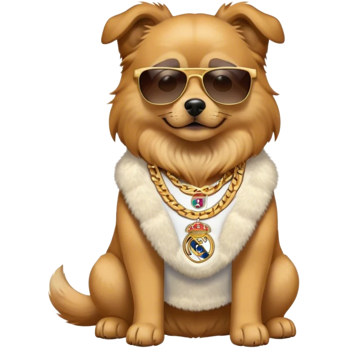 dog with an Real madrid dress and chain and sunglasses emoji | AI Emoji Generator