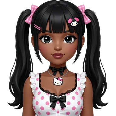 doll eyes with long lashes, dark brown skin, long brown hair, big chest, hello kitty necklace, one bow clip, pink and white polkadot tops emoji